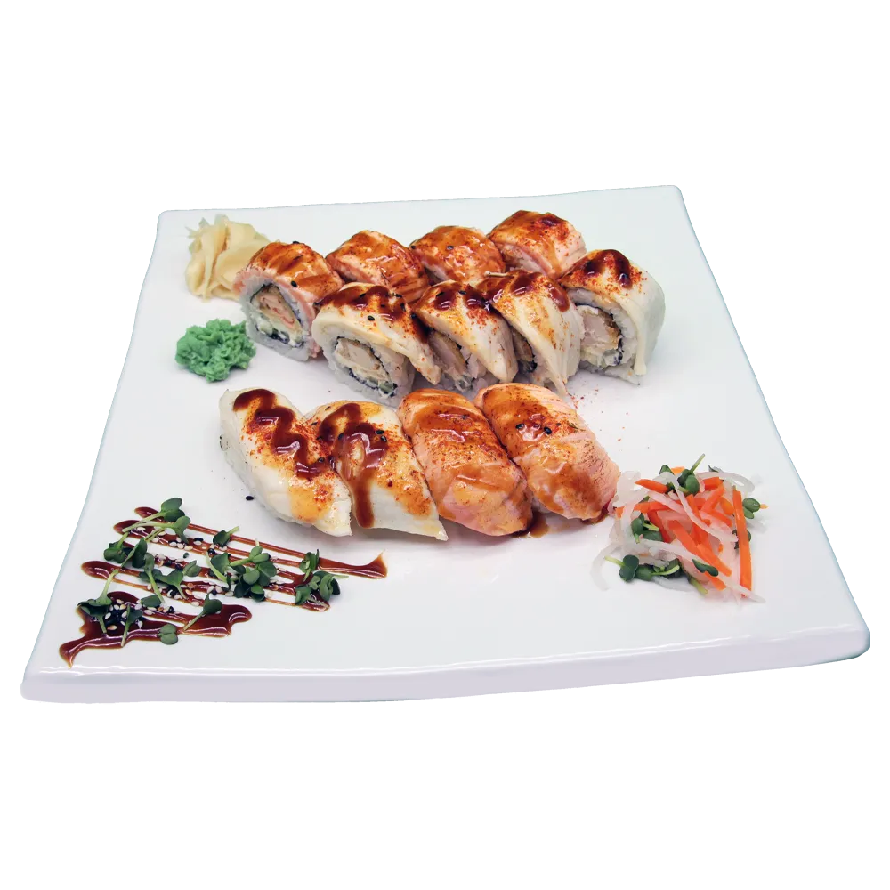 Sake Aburi (2 Stück), Mutsu Aburi (2 Stück), Kamikaze Roll (4 Stück), Fuji Roll (4 Stück)