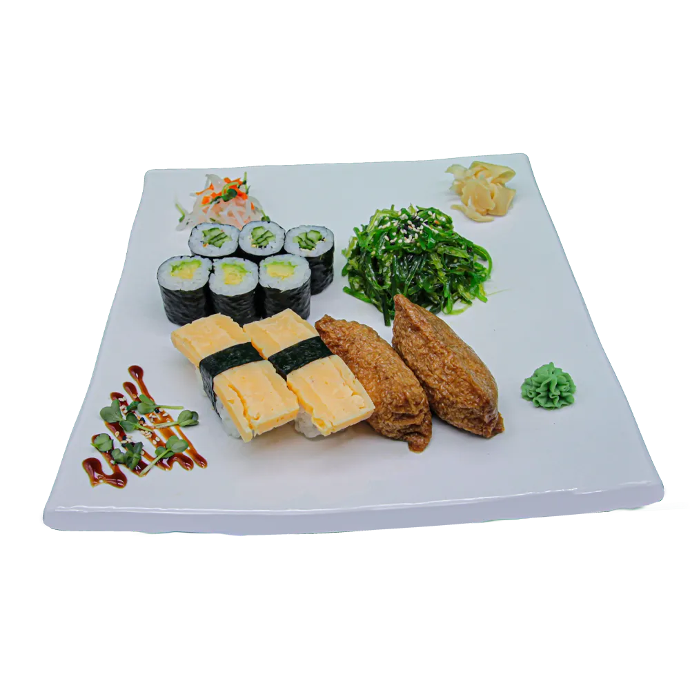 Inari (2 Stück), Tamago (2 Stück), Kappa-Maki (3 Stück), Avokado-Maki (3 Stück) und Algensalat