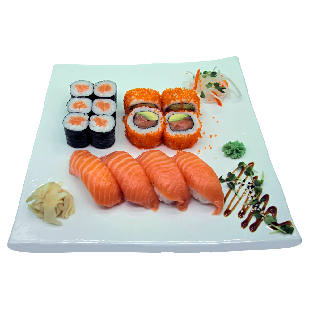 Sake Nigiri (4 Stück), Sake Maki (6 Stück), Sake Avocado Inside-Out-Maki (4 Stück)